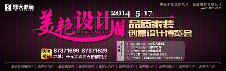 四月,享譽(yù)國際的“米蘭設(shè)計周”再次在家居界掀起了一股時尚創(chuàng)意潮流,也奠定了2014年的裝飾裝修理念和風(fēng)格。在這股時尚設(shè)計新風(fēng)席卷而來之時,視設(shè)計為根本的鼎天裝飾已率先而動,在本周的“鼎天裝飾美艷設(shè)計周”博覽會上,與米蘭同步,為甬城裝飾行業(yè)帶進(jìn)2014流行設(shè)計風(fēng)。要裝修的您,到5月17日開元大酒店五樓群賢廳看完“美艷設(shè)計周”,我們再定裝修。