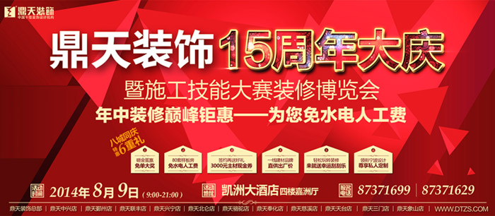 鼎天裝飾15周年大慶 為您免水電人工費(fèi) 世界杯結(jié)束了,留下無(wú)數(shù)個(gè)激情的夜晚;不過對(duì)將要裝修的業(yè)主來(lái)說,另一場(chǎng)更為重要的裝修“飾”界杯卻剛剛開始。由鼎天裝飾舉辦的裝修技能“飾”界杯,對(duì)需要裝修的業(yè)主們來(lái)說,這是一場(chǎng)不容錯(cuò)過的盛會(huì)。 8月9日(周六),鼎天裝飾15周年大慶暨施工技能大賽裝修博覽會(huì)將在凱洲大酒店四樓嘉洲廳盛大舉行。這場(chǎng)技能“飾”界杯,鼎天不僅帶來(lái)最強(qiáng)的設(shè)計(jì)師團(tuán)隊(duì)、王牌施工隊(duì)伍為“大賽房”業(yè)主服務(wù),而且還帶來(lái)了裝修巔峰鉅惠,砸金蛋贏免單大獎(jiǎng)、主材基金、免水電人工費(fèi)等重磅優(yōu)惠,讓您的裝修更加省錢、省心、省力。 年中裝修盛宴即將開啟,您還在等什么! 年中裝修巔峰鉅惠——瘋狂讓利引爆裝修 據(jù)悉,為慶15周年,鼎天裝飾為此次“施工技能大賽”活動(dòng)提供了年中最強(qiáng)裝修鉅惠。凡簽約客戶都可參加砸金蛋贏免單大獎(jiǎng);同時(shí),活動(dòng)現(xiàn)場(chǎng)還有眾多一線建材品牌直供出廠價(jià),讓您惠中加惠,輕松選購(gòu)遠(yuǎn)低于市場(chǎng)價(jià)的品牌建材。 此外,針對(duì)日益高漲的裝修人工費(fèi),以水電人工費(fèi)為例,目前市場(chǎng)普遍價(jià)格已漲至40至50多元每平米。本次大賽房活動(dòng),鼎天裝飾將對(duì)樣板房業(yè)主免去水電人工費(fèi)的特惠措施。如果以120平方米的房屋面積計(jì)算,業(yè)主在此次活動(dòng)中能節(jié)省成本6000多元,當(dāng)然住宅面積越大節(jié)省的成本越驚人。同時(shí),活動(dòng)推出的其他優(yōu)惠,將讓業(yè)主暢享過萬(wàn)元的裝修省錢之道。 引爆年中,這絕對(duì)是年中裝修的最瘋狂讓利! 施工品質(zhì)保障——讓您的家摘得優(yōu)秀裝飾工程獎(jiǎng) 施工技能大賽房活動(dòng),是鼎天裝飾公司內(nèi)部的一場(chǎng)技能大練兵,以此不斷砥礪自身的裝修服務(wù)內(nèi)功。活動(dòng)中,鼎天裝飾設(shè)定了多項(xiàng)評(píng)比項(xiàng)目,如最佳設(shè)計(jì)方案獎(jiǎng)、最佳工地形象獎(jiǎng)、最佳施工質(zhì)量獎(jiǎng)等,鼎天“至尊”工作室的設(shè)計(jì)師、優(yōu)秀施工團(tuán)隊(duì)都將角逐“比賽”,奪得屬于自己的殊榮,為業(yè)主們打造高品質(zhì)的生活之家。 同時(shí),“大賽房”活動(dòng)的優(yōu)秀案例還將角逐省(市)乃至全國(guó)的優(yōu)秀裝飾工程(設(shè)計(jì))獎(jiǎng)項(xiàng),成為讓人矚目的優(yōu)秀裝修作品。到場(chǎng)的業(yè)主還可實(shí)景體驗(yàn)國(guó)際前沿實(shí)景樣板房,感受國(guó)際潮流風(fēng)尚,尋找適合自己的生活方式。其中包括青林灣、維科上院、鈺鼎園、蘇園、印象外灘、星河國(guó)際、君瀾上府、榮安心居、中海凱旋門、鉑翠灣、東海府、集成廣場(chǎng)、紫玉花園、君雅苑、金色瓏庭、東都華庭、光大江灣府第、金橋水岸、公元世家、南熙園、宜家花園、晴園、麗景英郡、保利城、永和居易、芳辰麗陽(yáng)、華城花園、蝶園、IN藍(lán)庭、雷迪森廣場(chǎng)、英倫水岸、東湖觀邸、皇冠花園、盛世天城、江南一品、雍城世家、水岸楓情、BOBO城、風(fēng)格城事、上上城等甬城眾多中高端小區(qū)。 美艷5號(hào)、8號(hào)精裝套餐——輕松玩轉(zhuǎn)華麗裝修 在鼎天裝飾15周年大慶之際,鼎天特別推出美艷5號(hào)精裝作品終于華美綻放,美艷5號(hào)精裝作品實(shí)景房將在此次博覽會(huì)中正式向業(yè)主全面開放,并免費(fèi)接送實(shí)景參觀。歷時(shí)半年規(guī)劃,集合鼎天至尊工作室強(qiáng)大的設(shè)計(jì)力量,呈現(xiàn)當(dāng)代人居嶄新美學(xué)見解。通過全方位資源整合并質(zhì)量驗(yàn)證,配備完整無(wú)縫連接的服務(wù),以及裝修總價(jià)與單價(jià)高低簡(jiǎn)單明了等優(yōu)勢(shì),相比常規(guī)裝修能節(jié)省費(fèi)用400-500元/平方米。還有針對(duì)都市白領(lǐng)、經(jīng)典婚房、大平層及改善型裝修所打造的美艷8號(hào)精裝套餐,本次活動(dòng),裝修業(yè)主將有更多精裝套餐方案可選,輕松玩轉(zhuǎn)裝修!本次活動(dòng),鼎天裝飾還為所有到場(chǎng)的客人準(zhǔn)備了一份特別的禮物;15周年大慶活動(dòng)將在寧波城區(qū)、鎮(zhèn)海、北侖、奉化、慈溪、天臺(tái)、三門、象山等八城同慶。 特別預(yù)告: 鼎天裝飾15周年大慶禮獻(xiàn)全城 8月9日(周六)9:00---21:00,鼎天裝飾將在凱洲大酒店(天一廣場(chǎng)南面)四樓嘉洲廳舉辦“施工技能大賽房品質(zhì)裝修博覽會(huì)”, 活動(dòng)現(xiàn)場(chǎng)盡享家裝建材大特價(jià)。同時(shí)現(xiàn)場(chǎng)限量征集80套鼎天“比武大賽”樣板房,樣板房不僅享受鼎天15周年大慶裝修特惠,且還為您免去水電人工費(fèi),并由鼎天至尊工作室、金牌施工團(tuán)隊(duì)聯(lián)手打造完美家裝樣板工程。