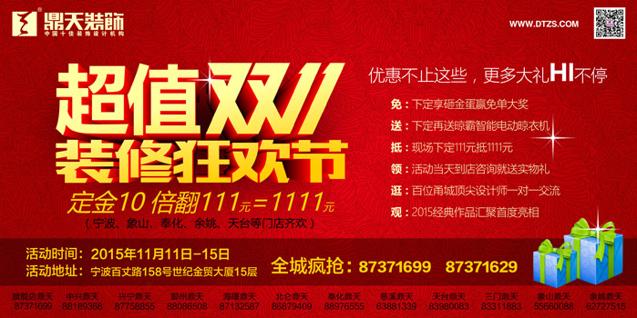 定金10倍翻 雙11來了,并且是來真的了!這是我們有史以來第1次,一年也只有1次,我們的“雙11”!不用秒殺,不用剁手,只需要111元就可以定裝修。 11月11日—15日鼎天裝飾特舉辦《裝修狂歡節(jié),超值雙11》裝修狂歡周活動(dòng),此次活動(dòng)鼎天裝飾將在寧波城區(qū):總部旗艦店、鼎天海曙店、鼎天中興店、鼎天鄞州店、鼎天興寧店以及鼎天奉化、象山、余姚、天臺(tái)等門店同歡?;顒?dòng)時(shí)間內(nèi),與鼎天下定就可以享受定金10倍翻的優(yōu)惠活動(dòng),下定111元=1111元,如此超值,一年僅一次,就在這一周!