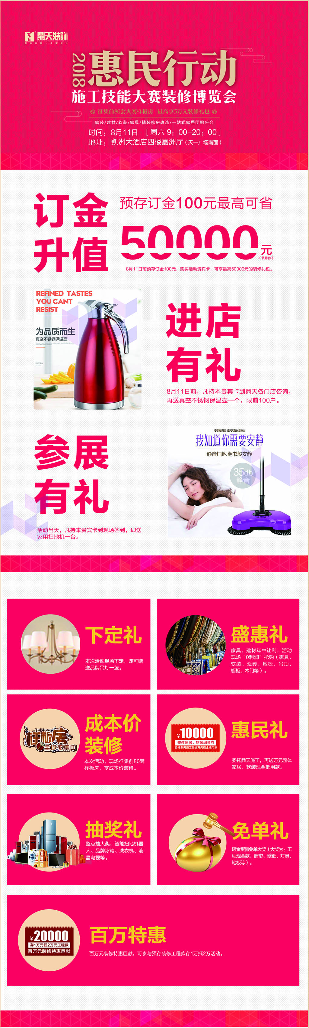 特別預(yù)告:8月11日(周六)9:00-20:00,鼎天裝飾在凱洲大酒店四樓嘉洲廳(天一廣場南面)舉辦“施工技能大賽裝修博覽會”活動,現(xiàn)場限量征集100套 大賽樣板房,悅享百萬裝修特惠,并由鼎天至尊工作室、金牌施工團隊聯(lián)手打造完美家裝樣板工程?,F(xiàn)場還尊享一站式家裝建材購齊服務(wù)。種種福利,燃爆 8月!