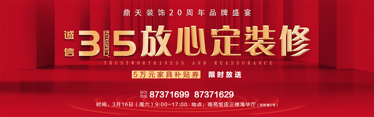 特別預(yù)告 3月16日(周六)9:00-17:00,鼎天裝飾在南苑飯店三樓海華廳(靈橋路2號(hào))舉辦20周年品牌盛宴【誠(chéng)信3.15,放心定裝修】大型活動(dòng),5萬元家具補(bǔ)貼限時(shí)放送,悅享百萬春季特惠。鼎天以五星級(jí)酒店室內(nèi)裝修施工管理標(biāo)準(zhǔn)為您打造品質(zhì)美家。 樣板房報(bào)名熱線:87371629 貴賓熱線:87371699 |