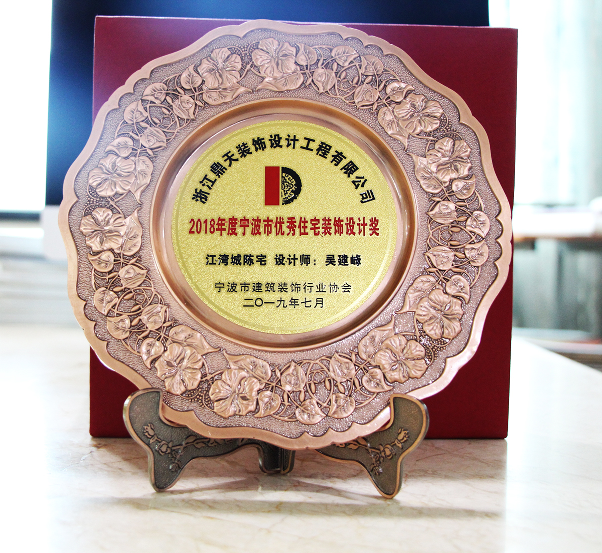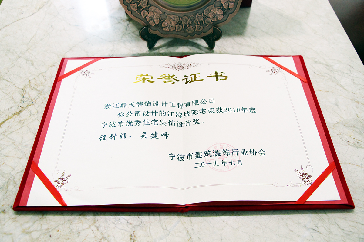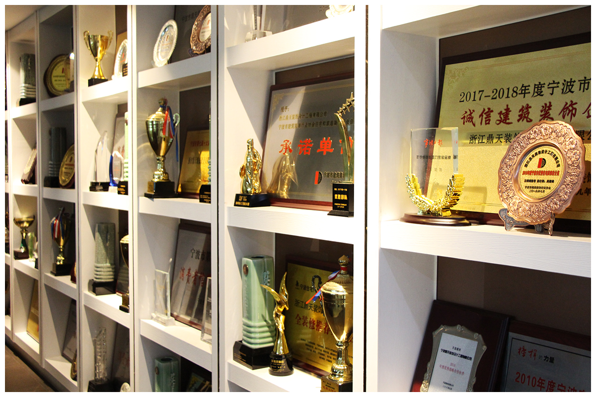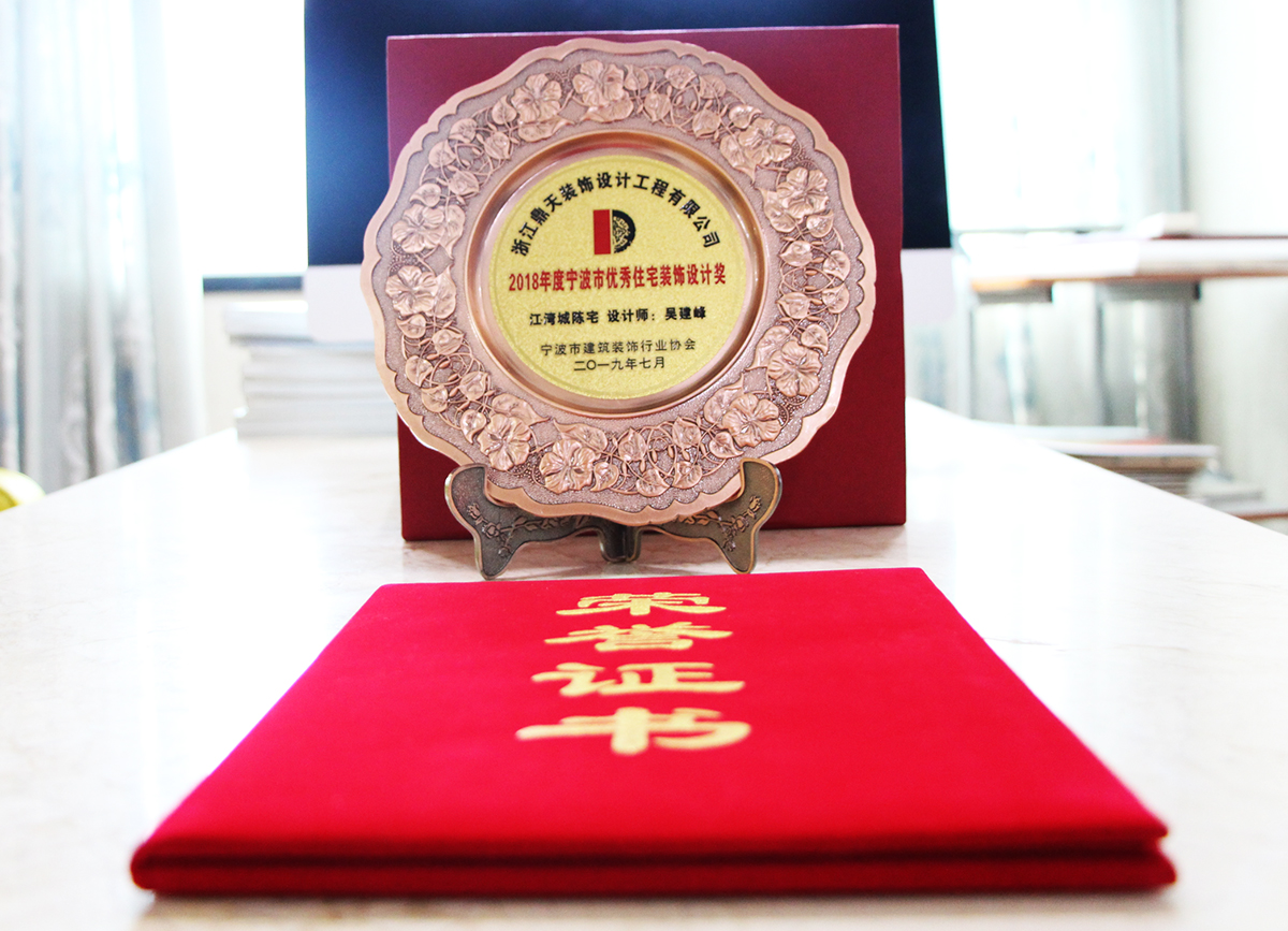 ▲優(yōu)秀住宅裝飾設(shè)計獎牌 自鼎天1999年成立以來,已連年獲得寧波市消費者信得過單位、年度影響力家裝品牌、誠信建筑裝飾企業(yè)、全裝修推薦家裝企業(yè)等共計百余項獎項。