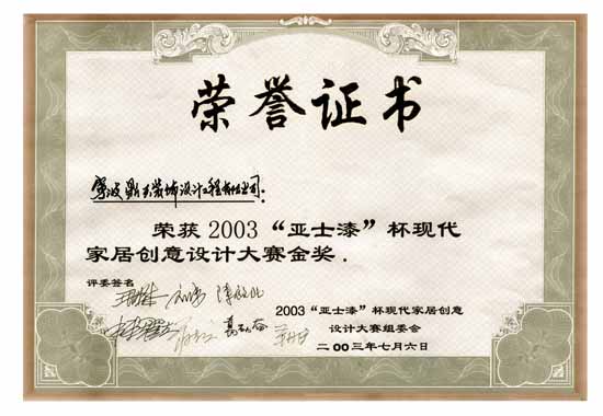 | 2003年07月 榮獲寧波市"亞漆杯"室內(nèi)裝飾設(shè)計(jì)大賽金獎 |