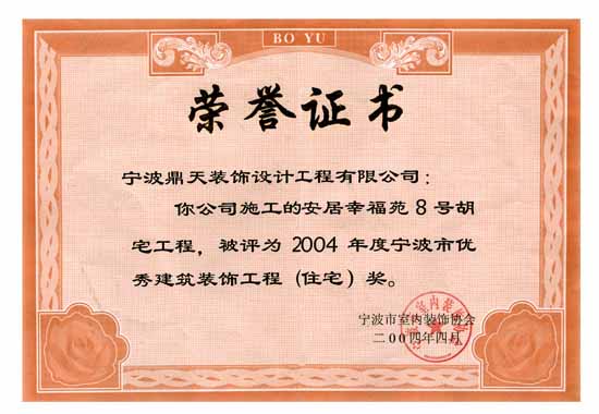 | 2004年04月 榮獲2004年度寧波市優(yōu)秀建筑裝飾工程(住宅)獎(二項) |