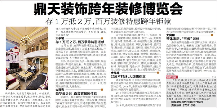 裝修要超級(jí)快樂(lè),12月13日,參加鼎天裝飾跨年裝修博覽會(huì)。屆時(shí),存1萬(wàn)抵2萬(wàn)工程款,享百萬(wàn)元跨年裝修特惠、一線品牌建材抄底收官,可省錢;由鼎天至尊工作室設(shè)計(jì)師團(tuán)隊(duì)設(shè)計(jì),金牌施工團(tuán)隊(duì)施工,可省心;分享千余套經(jīng)典裝修案例、體驗(yàn)百余套實(shí)景樣板房,可安心。 鼎天裝飾跨年裝修博覽會(huì)將讓跨年裝修消費(fèi)者暢享裝修、建材的年底收官特惠,有利歸避年后材料、人工費(fèi)漲價(jià)行情?;顒?dòng)中,存1萬(wàn)可抵用2萬(wàn)工程款,而且不在年底裝修的業(yè)主,可將這個(gè)優(yōu)惠保留至年后?,F(xiàn)場(chǎng)眾多一線建材品牌推出年底驚爆價(jià),并現(xiàn)金返還讓利,即繳納定金2個(gè)建材品類及以上,活動(dòng)當(dāng)場(chǎng)返還最高2000元現(xiàn)金。品牌建材涵蓋瓷磚、地板、櫥柜、吊頂、軟飾、家具、廚電等眾多品類。其次,活動(dòng)當(dāng)天與鼎天裝飾下定還可參與砸金蛋贏免單大獎(jiǎng),最高可贏整套櫥柜搬回家。 活動(dòng)中,您可實(shí)地參觀百余套鼎天在裝工地,專車接送前住包括青林灣、寰宇天下、東海府、濱江府、景瑞上府、羅蒙環(huán)球城、鉑翠灣、東方一品、天境花園、海外灘、新外灘一號(hào)、中海國(guó)際社區(qū)、銘豪觀樾、維科上院、鈺鼎園、蘇園、印象外灘、星河國(guó)際、舒沁苑、君和院、銀億東岸、風(fēng)格尚品、盛世華府、金億文園、悅瀾灣、景瑞望府、君瀾上府、榮安心居、藏瓏、締壹城、君園和莊、山清軒、銀億上郡、文瀾水岸、左岸尚苑、金色江山、水榭花都、紫玉花園、麗江苑、君雅苑、金色瓏庭、東都華庭、宜家花園、晴園、麗景英郡、保利城、芳辰麗陽(yáng)、英倫水岸、東湖觀邸、盛世天城、江南一品、雍城世家、上上城等甬城知名小區(qū)。 如果想做裝修“甩手掌柜”,鼎天裝飾也準(zhǔn)備了整體家居解決方案,滿足您省心、省力、省錢的“三省”裝修需求。方案借鑒大量?jī)?yōu)秀裝修案例,洞悉人們的日常生活,最大化確保居住的舒適性和功能使用的合理性。目前,鼎天裝飾成功推出的美艷1號(hào)、美艷5號(hào)、美艷8號(hào)及美艷999等整體家居方案,已在市場(chǎng)上取得了巨大成功,深受都市白領(lǐng)、經(jīng)典婚房及改善型裝修者的青睞。另外,在有效地資源整合下,鼎天整體家居方案比常規(guī)裝修能節(jié)省費(fèi)用400-500元/平方米。 特別預(yù)告: 12月13日(周日)9:00---17:00,鼎天裝飾在凱洲大酒店二樓聚龍軒(天一廣場(chǎng)南面)舉辦“跨年裝修博覽會(huì)”,現(xiàn)場(chǎng)限量征集200套“跨年施工”樣板房,百萬(wàn)裝修特惠鉅獻(xiàn),且由鼎天至尊工作室、金牌施工團(tuán)隊(duì)聯(lián)手打造完美家裝樣板工程。現(xiàn)場(chǎng)還尊享一站式家裝建材購(gòu)齊服務(wù),高達(dá)萬(wàn)元的種種福利,不敢私藏! 樣板房報(bào)名熱線:87371629 貴賓熱線:87371699 摘自2015年12月10日 寧波東南商報(bào) |