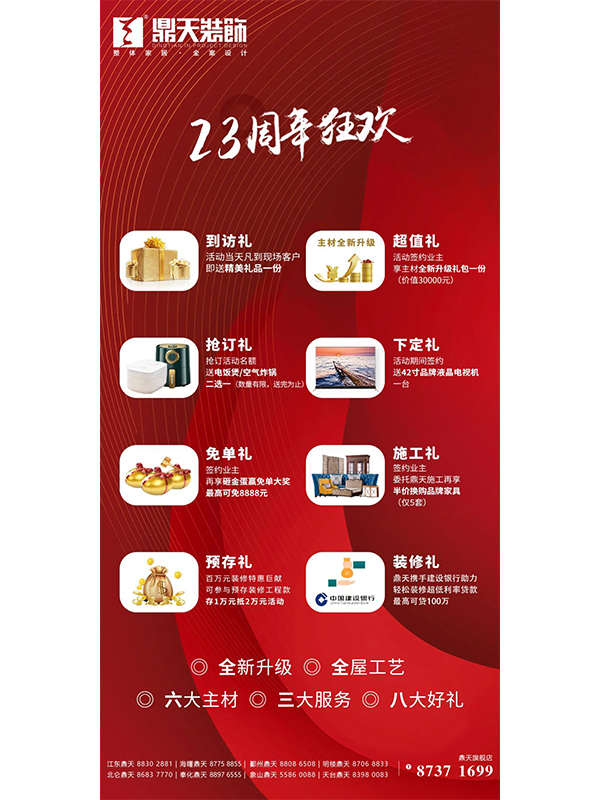近期有裝修計劃的你,可以掃描下方二維碼,讓我們專業(yè)設(shè)計師和施工團(tuán)隊為你打造“理想之家?!蓖低蹈嬖V你,美艷1號精裝套餐最劃算哦!活動當(dāng)天,前300名簽到客戶,即可免費(fèi)領(lǐng)取潔麗雅高檔毛巾禮盒一套,現(xiàn)場還有多重豪禮等你來拿!掃描下方二維碼,與鼎天在線溝通 ↓↓↓