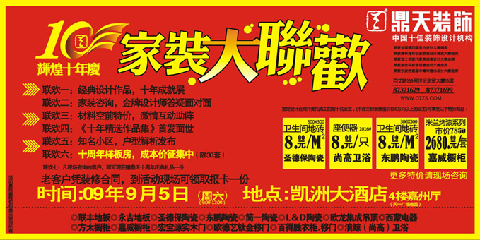 9月5 日(周六)9:00---17:00,鼎天裝飾將在凱洲大酒店(天一廣場南面)四樓嘉洲廳舉辦鼎天十年慶典家裝咨詢會(huì)和優(yōu)秀家裝作品圖片展,到活動(dòng)現(xiàn)場盡享家裝建材大特價(jià)。
