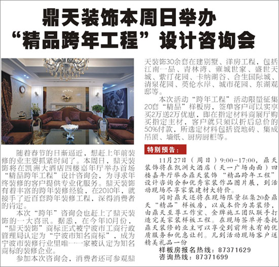 鼎天裝飾本周日舉辦“精品跨年工程”設(shè)計(jì)咨詢會(huì)
