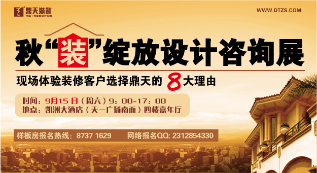 9月15 日(周六)9:00---17:00,鼎天裝飾將在凱洲大酒店(天一廣場(chǎng)南面)四樓嘉年廳舉辦鼎天裝飾2012秋“裝”綻放設(shè)計(jì)咨詢會(huì)和優(yōu)秀家裝作品圖片展,到活動(dòng)現(xiàn)場(chǎng)盡享家裝建材大特價(jià)。同時(shí)鼎天還將在現(xiàn)場(chǎng)限量征集20套鼎天“精品”樣板房,以成本價(jià)為其裝修,由鼎天至尊工作室、金牌施工團(tuán)隊(duì)聯(lián)手打造完美家裝樣板工程。而在現(xiàn)場(chǎng)簽單并委托鼎天裝修的業(yè)主可以享受到前所未有的優(yōu)質(zhì)服務(wù)和優(yōu)惠讓利。凡到活動(dòng)現(xiàn)場(chǎng)客戶送精美禮品一份。