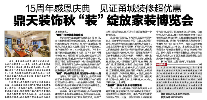 9月21日(周日)9:00---17:00,鼎天裝飾將在寧波香格里拉大酒店一樓甬城宴會廳舉辦“15周年感恩慶典之秋‘裝’綻放家裝博覽會”, 活動現(xiàn)場盡享家裝建材直供出廠最低價。同時現(xiàn)場限量征集前60套鼎天15周年“感恩特惠”樣板房以成本價為其裝修,樣板房不僅享受鼎天15周年大慶裝修特惠,且由鼎天至尊工作室、金牌施工團(tuán)隊(duì)聯(lián)手打造完美家裝樣板工程。