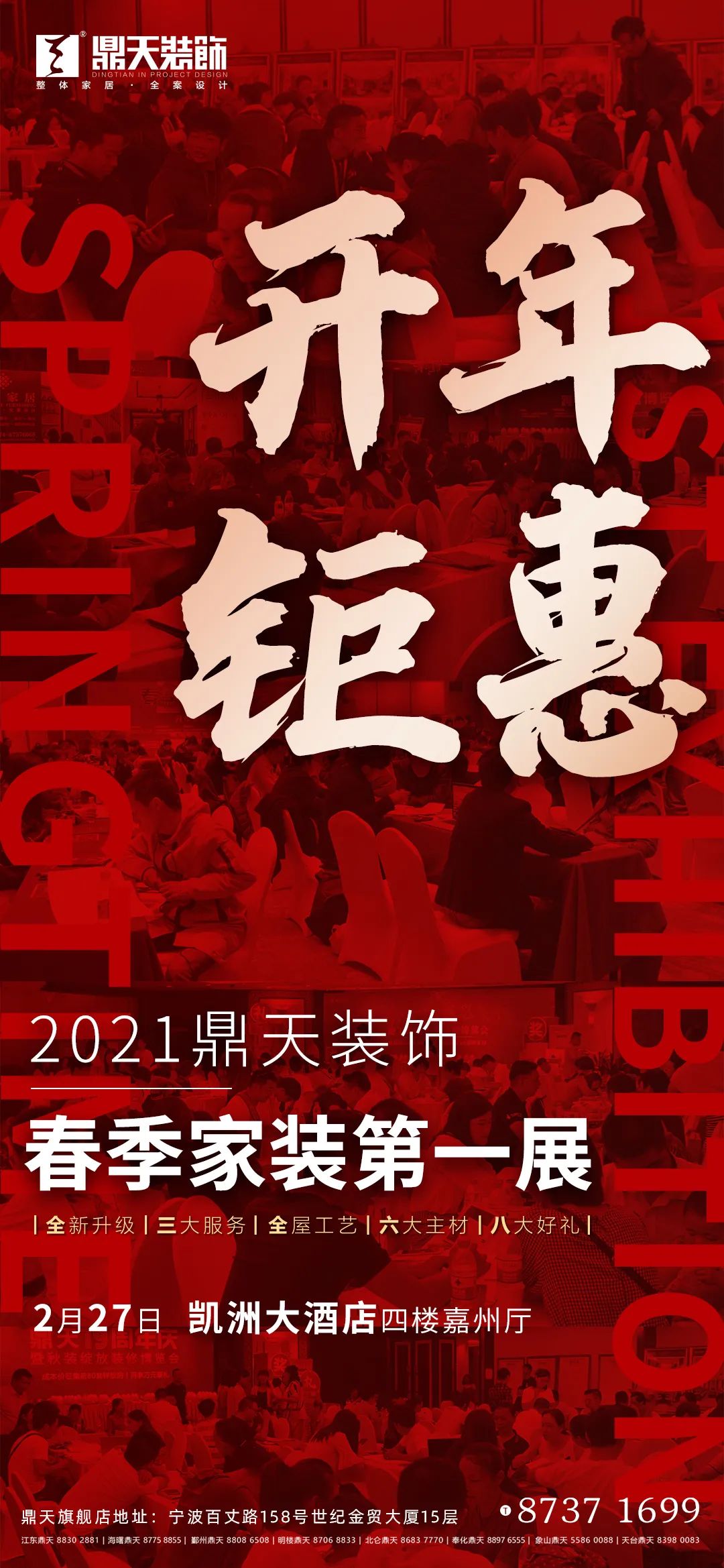 新年相關(guān)預(yù)告 2月27日(周六)9:00-17:00,鼎天裝飾【春季家裝第一展】開年鉅惠活動,于凱洲大酒店四樓嘉州廳(天一廣場南面)舉辦。