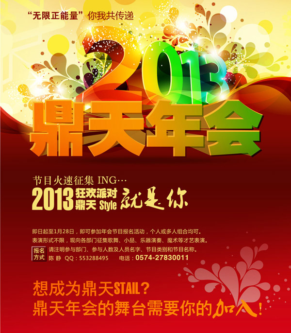 近日,“無限正能量”你我共傳遞鼎天2013年會節(jié)目征集活動正式開啟,自即日起至1月28日,凡鼎天集團員工即可報名參加2013年會節(jié)目報名活動,盛大的年會舞臺期待著每一位鼎天人的身影!