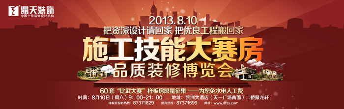 8月10日(周六)9:00---21:00,鼎天裝飾將在凱洲大酒店(天一廣場南面)二樓聚龍軒舉辦“施工技能大賽房品質裝修博覽會”, 活動現(xiàn)場盡享家裝建材大特價。同時現(xiàn)場限量征集60套鼎天“比武大賽”樣板房,不僅享受免水電人工費的特別盛惠,而且將由鼎天至尊工作室、金牌施工團隊聯(lián)手打造完美家裝樣板工程。凡到活動現(xiàn)場客戶送精美禮品一份。