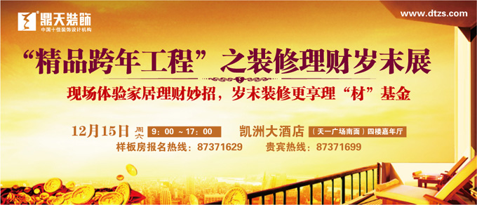 12月 15日(周六)9:00---17:00,鼎天裝飾將在凱洲大酒店(天一廣場(chǎng)南面)四樓嘉年廳舉辦鼎天裝飾 “精品跨年工程”之裝修理財(cái)歲末展,到活動(dòng)現(xiàn)場(chǎng)盡享家裝建材大特價(jià)。同時(shí)鼎天還將在現(xiàn)場(chǎng)限量征集20套“精品”樣板房,以成本價(jià)為其裝修,“精品”樣板工程不僅享受歲末特別盛惠,還將獲得由鼎天至尊工作室、金牌施工團(tuán)隊(duì)聯(lián)手打造完美家裝樣板工程。凡到活動(dòng)現(xiàn)場(chǎng)客戶送賀歲好禮一份